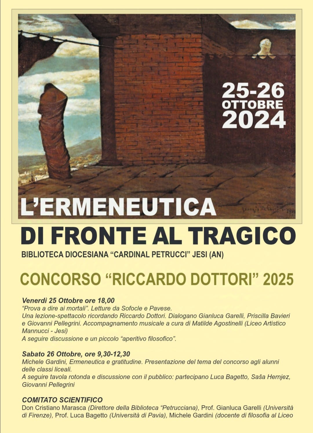 La Biblioteca diocesana “Cardinal Petrucci” di Jesi propone la seconda edizione del concorso “Riccardo Dottori” che sarà presentato in due giornate, il 25 e il 26 ottobre. Il tema del 2024 era “Vivere filosoficamente” mentre per il 2025 il comitato scientifico (composto da docenti e ricercatori delle Università di Firenze, Torino e Pavia) ha scelto “L’ermeneutica di fronte al tragico”.