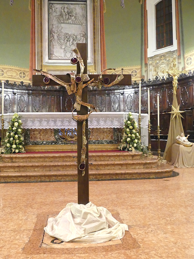 Oggi la croce è stata profondamente trasformata: il suo legno, lucidato e nobilitato, è parzialmente ricoperto da sinuosi panneggi bronzei, quasi impronta del Crocifisso che un tempo ha accolto, impreziositi da gemme di vetro di color purpureo che simboleggiano le piaghe redentrici di Cristo. La Croce Dolorosa si sta trasformando, proprio sotto la spinta irresistibile dell’Amore di Gesù crocifisso e risorto, in una Croce Gloriosa. Le gemme e l’oro ricordano il trionfo di Cristo e il destino di gloria che attende ognuno di noi, che alla sua morte e resurrezione è stato unito indissolubilmente per mezzo del Battesimo. Al tempo stesso il legno, ancora visibile in tutta la sua rigidità, ci ricorda come questa condizione, sebbene reale, non sia del tutto compiuta in noi, pellegrini sulla terra, che viviamo nella dimensione del “già e non ancora”: già salvati da Cristo ma non ancora nella pienezza della Gloria di Dio.