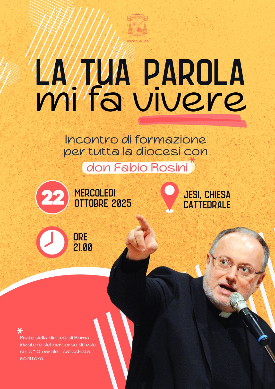 Dopo le assemblee del mese di giugno, in cui il Vescovo Paolo ha indicato l’ascolto e la meditazione della Parola di Dio come priorità per il cammino diocesano, la nostra diocesi si dà appuntamento il 22 ottobre alle 21 in cattedrale per un incontro di formazione guidato da don Fabio Rosini, prete della diocesi di Roma, autore di diverse pubblicazioni e ideatore del cammino di fede sulle 10 Parole.