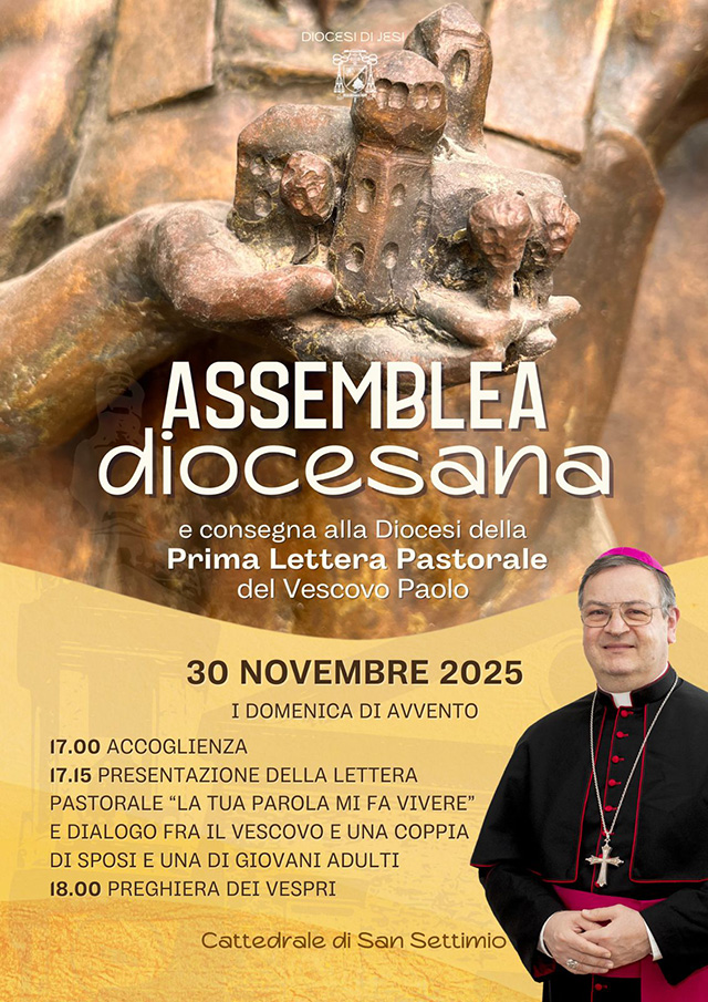 L’assemblea diocesana con il vescovo Paolo sarà la prima domenica di Avvento, il 30 novembre alle 17, in Cattedrale a Jesi. Il Vescovo commenterà e consegnerà alla diocesi la sua lettera pastorale che ha intitolato “La tua Parola mi fa vivere”, a seguire dialogherà con una coppia di sposi e con una coppia di giovani adulti. Alle 18 si pregherà insieme il vespro.